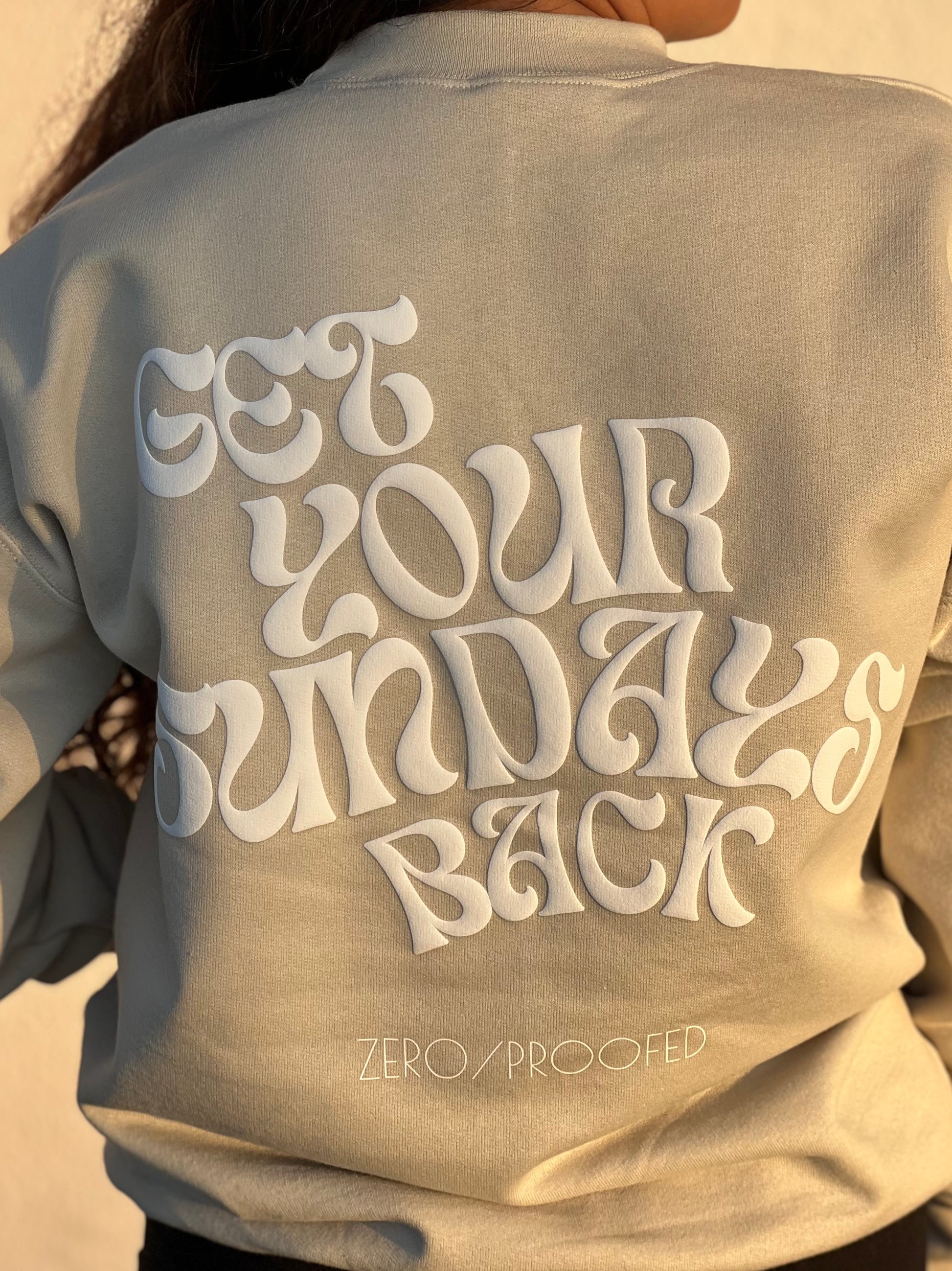 Our Get Your Sundays Back (GYSB) Sweatshirt is a 100% cotton crewneck with our signature ethos in premium bubble print. This comfortable and stylish piece is perfect for anyone looking to celebrate “getting your Sundays back”! Designed by the Zero Proofed Sisters and handmade locally in Venice, CA.